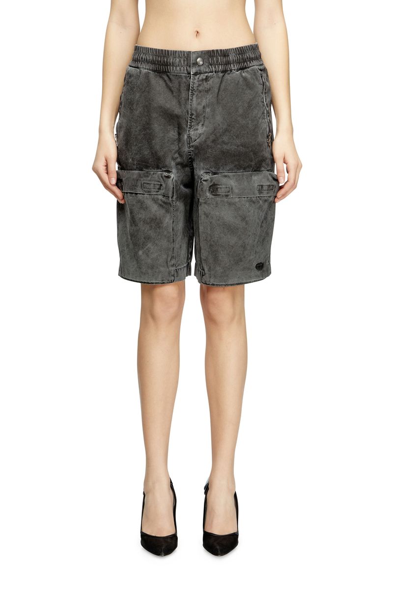 Calções cargo femininos confeccionados em sarja de algodão orgânico. Com um "D" oval bordado em tom sobre tom na perna e bolsos aplicados nas coxas, estes calções são verdadeiramente utilitários. O visual é reforçado pelos bolsos com fecho de correr e puxadores personalizados, além de um tratamento de lavagem que confere ao tecido um acabamento desgastado.