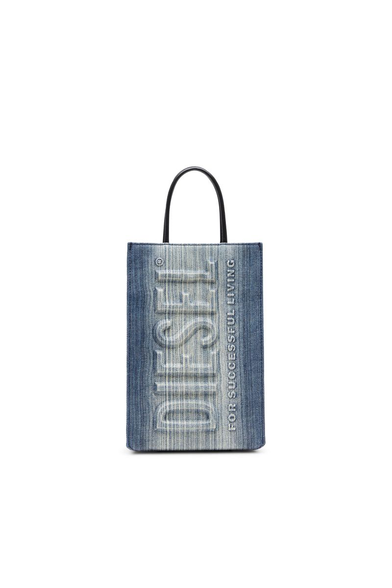 Esta sacola de compras unissex é confeccionada em jeans com um toque experimental. Tratado com técnicas de solarização para conferir um desbotamento em tons quentes, o tecido DNA apresenta uma rica tonalidade e se define por seu padrão visualmente impactante de listras verticais. O logotipo em alto-relevo na parte frontal é extragrande e com efeito 3D. Carregue esta sacola pelas alças de couro ou utilize a alça removível.