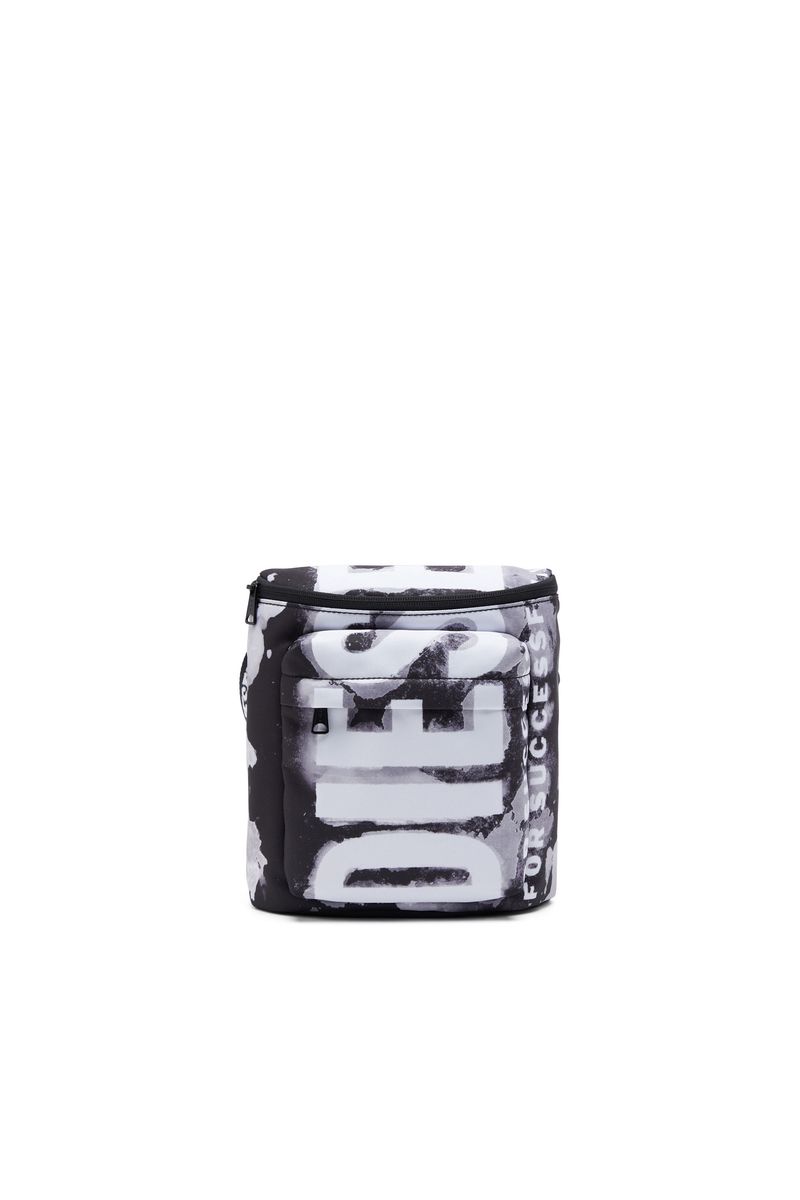 Esta bolsa crossbody unissex é feita de tecido preto semelhante a lona, ??estampado em toda parte com o logotipo da Diesel com efeito sangrento. Possui um prático bolso com zíper na frente e vem com uma alça ajustável correspondente.