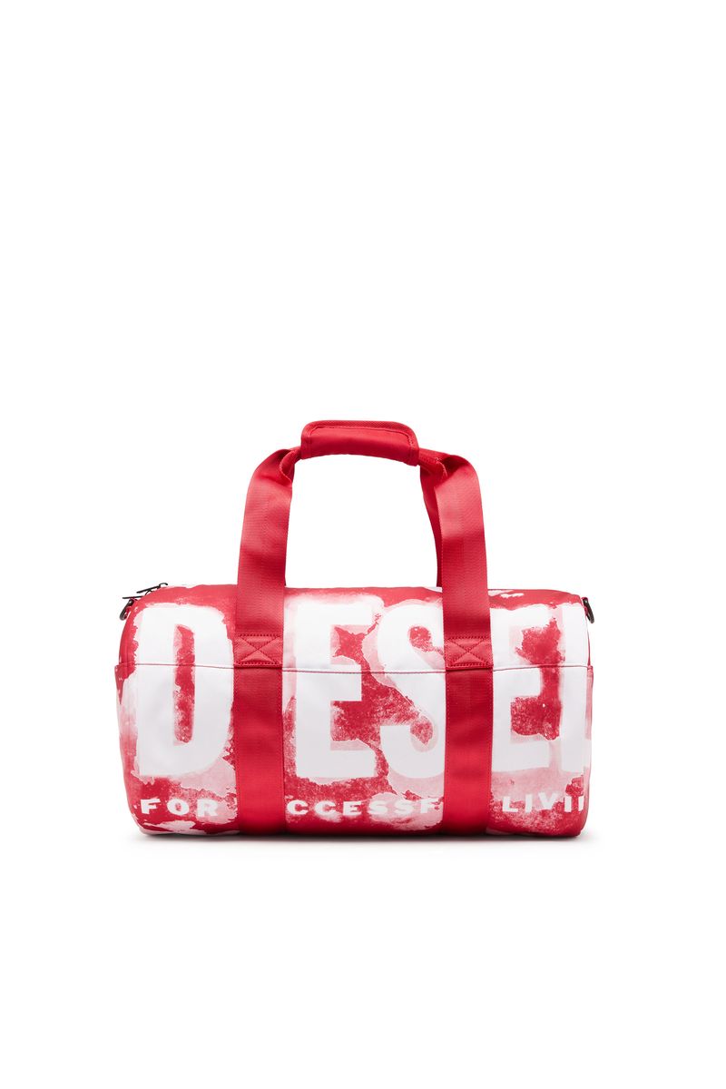Esta bolsa-mala da Diesel é um modelo unissex feito de tela vermelha com efeito canvas. Impressa com um logotipo maxi manchado, a bolsa é completada com alças duplas e vários bolsos internos e externos.