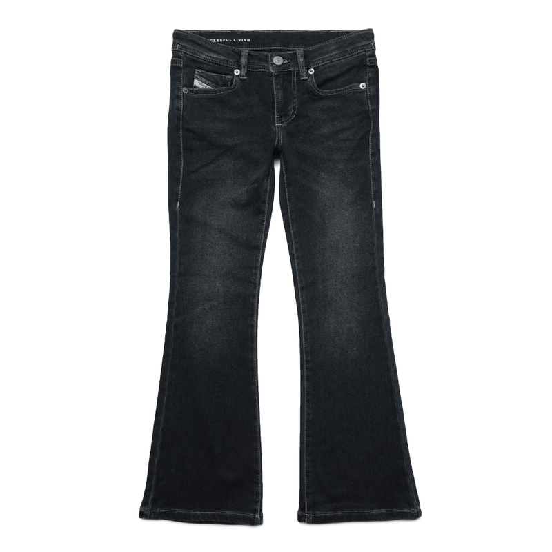 Estilo bootcut com cintura baixa e cobertura mais alta nas costas. Este clássico jeans slim para menina com atitude boêmia abraça o corpo dos quadris aos joelhos. Confeccionado em tecido JoggJeans para maior conforto, este par apresenta lavagem azul escuro com costura contrastante e visual vivido. Stonewashed para maior suavidade.