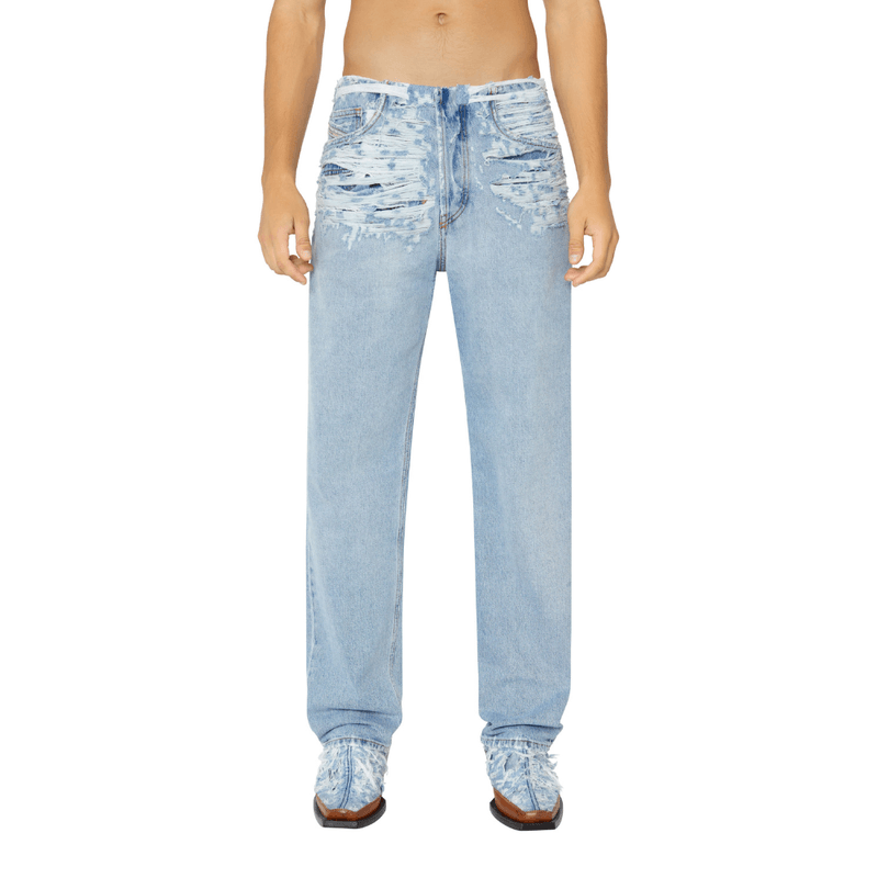 Apresentando um visual destruído e visualmente impactante, este jeans fix em azul médio é lavado em pedra para maior suavidade e detalhado com abrasões feitas à mão "tiger break" que canalizam uma atitude audaciosa e disruptiva.