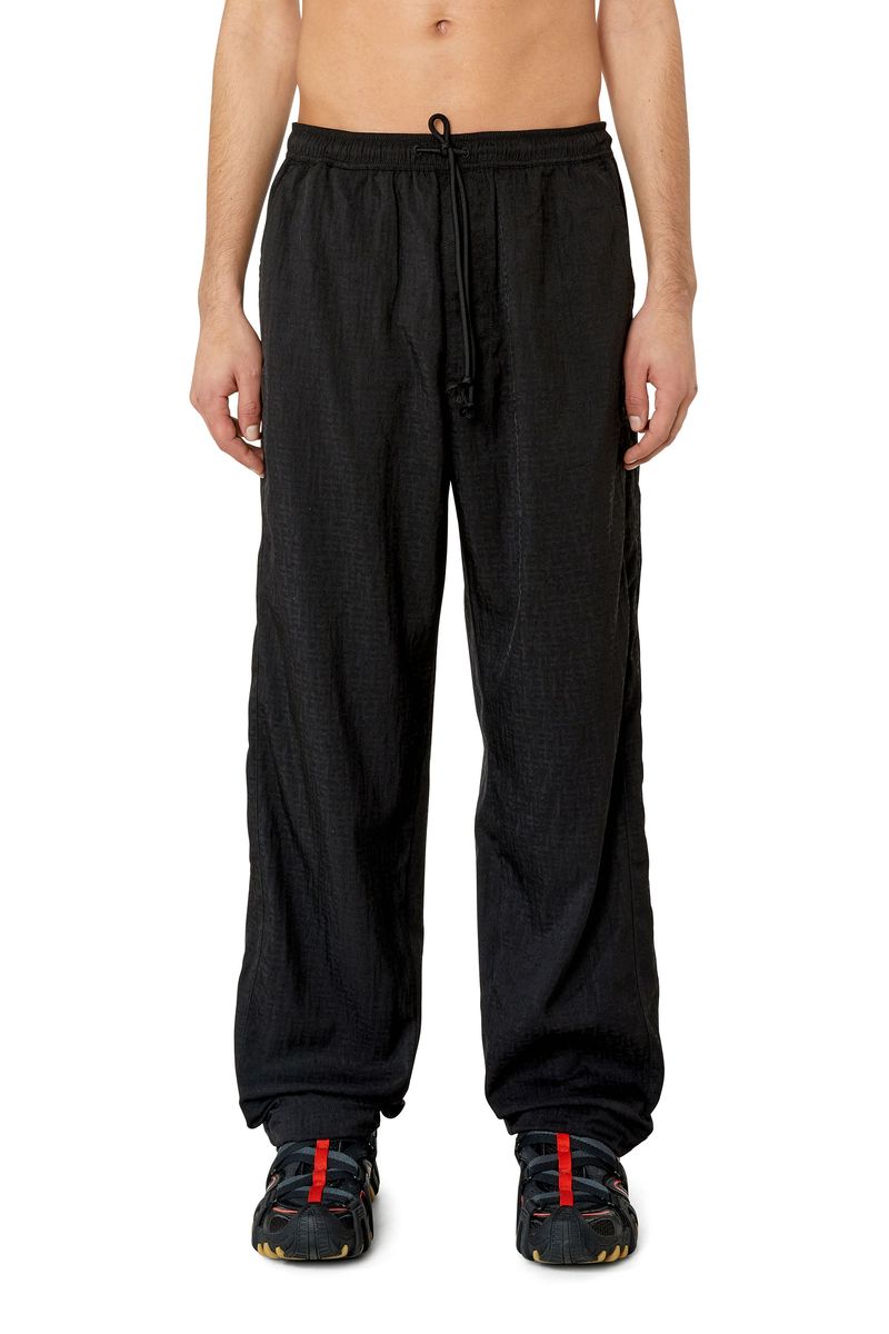 Esta calça jogging masculina é confeccionada em náilon jacquard com acabamento de efeito vintage, enriquecida com um sutil monograma em toda a peça. A silhueta de ajuste regular apresenta uma perna larga e faixas laterais tonais. Um patch D oval é bordado no bolso de trás.