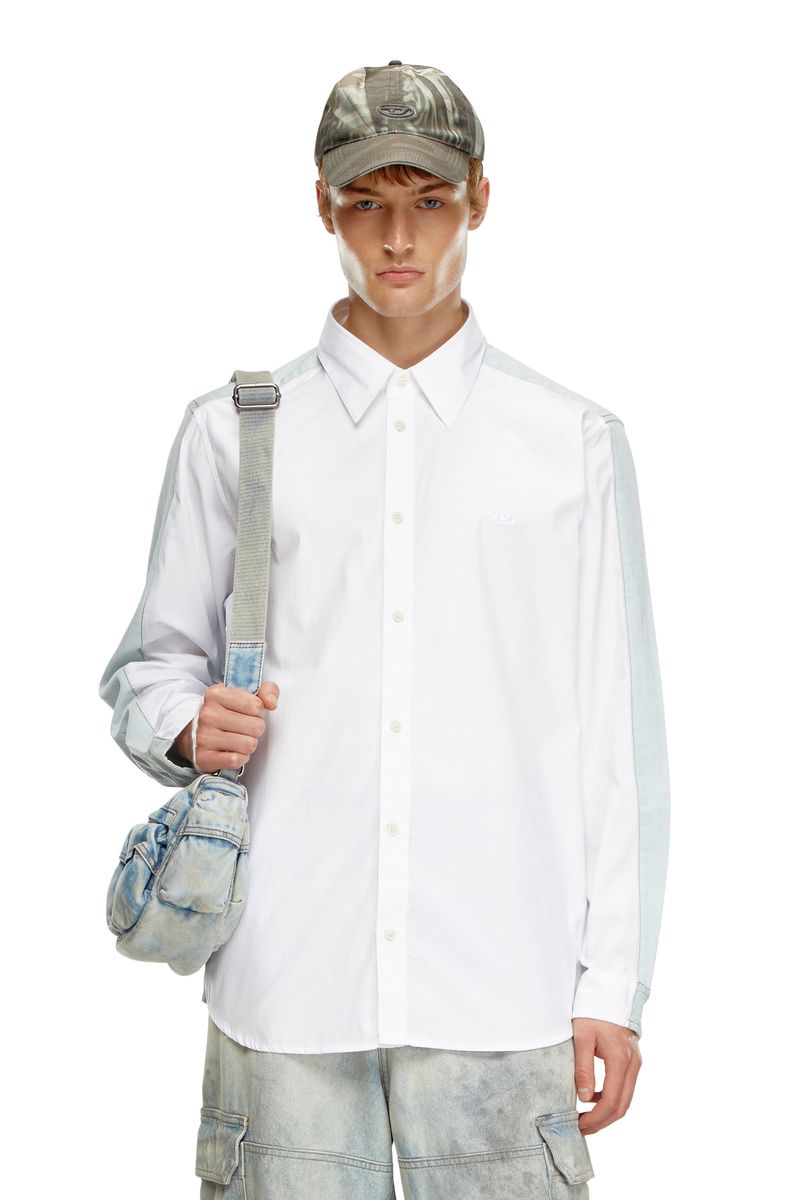 Esta camisa híbrida masculina é feita de popeline de algodão e jeans, costurados para criar dois estilos diferentes na frente e atrás. Ela tem caimento regular e fecho por botões. O D oval bordado no peito é um detalhe sutil do logotipo.