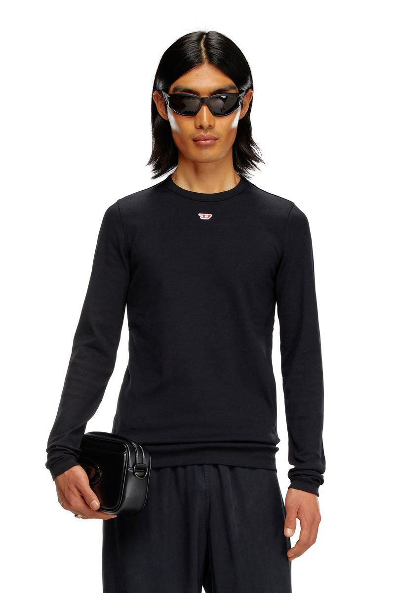 Esta camiseta masculina de manga comprida é um modelo essencial com gola redonda, adornada com um pequeno patch vermelho em forma de "D". É confeccionada em algodão orgânico e possui modelagem slim.