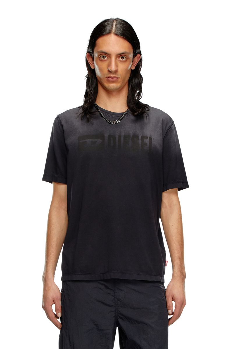 Camiseta masculina de corte regular, confeccionada em jersey de algodão orgânico. Um tratamento especial em spray confere um visual autêntico desbotado pelo sol, acentuado pelas bordas desfocadas da estampa tonal Diesel Denim Division. Finalizada com uma etiqueta Diesel no lado esquerdo.