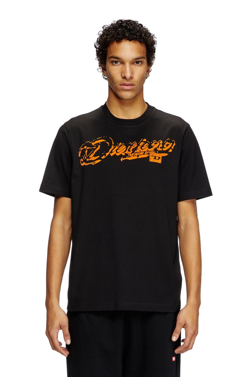 Camiseta masculina de corte regular, confeccionada em jersey de algodão orgânico. O logotipo Diesel Core flocado na frente parece ter se desgastado com o tempo.