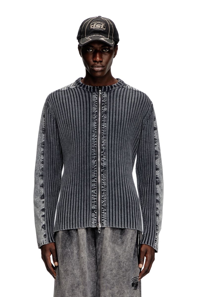 Cardigã masculino em malha canelada de algodão. Uma peça utilitária essencial para a cidade, este cardigã com zíper frontal possui painéis de tecido tratado nos ombros e mangas, e foi lavado para obter um efeito marmorizado e desbotado. Observe o acabamento laqueado no puxador do zíper com o logo "D" na parte superior.