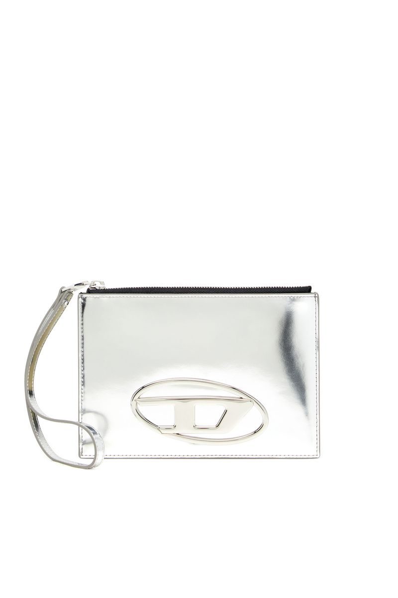 Esta bolsa feminina com fecho de correr possui uma alça de pulso para facilitar o transporte. Com um acabamento brilhante de um lado, semelhante a um espelho, é feita de couro de origem responsável e adornada com um detalhe metálico oval em forma de D, também brilhante. O formato é fino, mas prático, graças ao fole lateral.