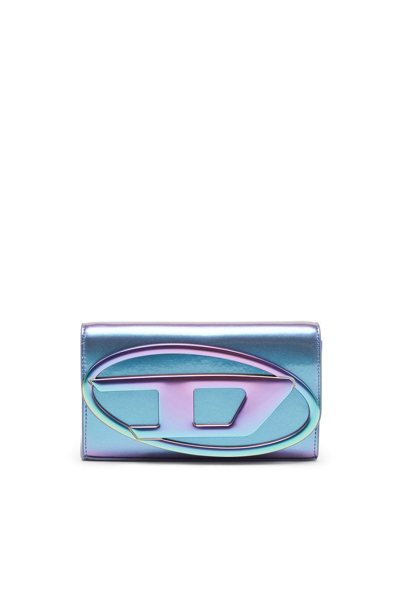 Esta carteira maxi também funciona como uma minibolsa graças à alça removível. Decorada com a placa oval D exclusiva que identifica a icônica bolsa 1DR, ela é caracterizada por um efeito iridescente em tons ácidos do arco-íris.