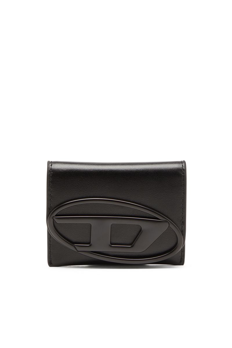 Porta-cartões em couro preto liso, com design prático e dobrável, com vários compartimentos para cartões e fecho de pressão seguro. A aba arredondada possui um D oval metálico com acabamento fosco e na mesma tonalidade.
