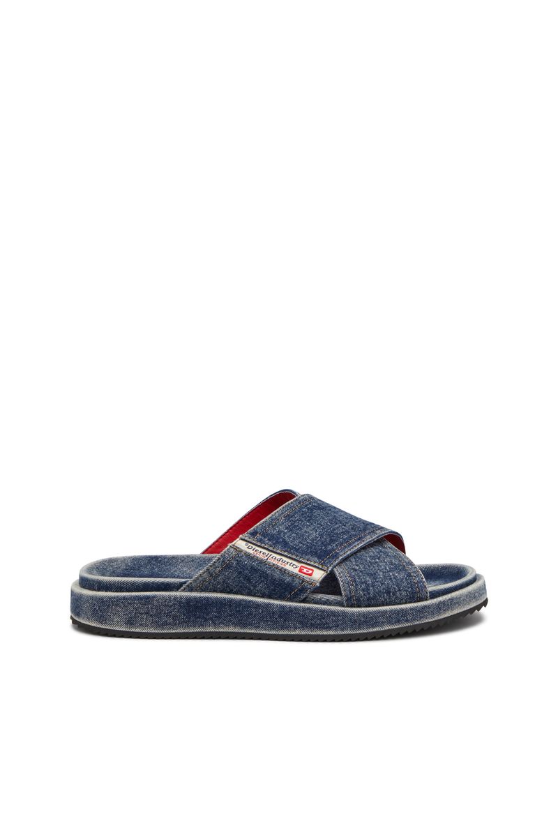 Confeccionadas em denim lavado, estas sandálias unissex apresentam tiras largas cruzadas adornadas com a icônica etiqueta do quinto bolso – um detalhe característico das calças jeans Diesel. Possuem palmilhas moldadas com estampa do logotipo para maior conforto e solados antiderrapantes.