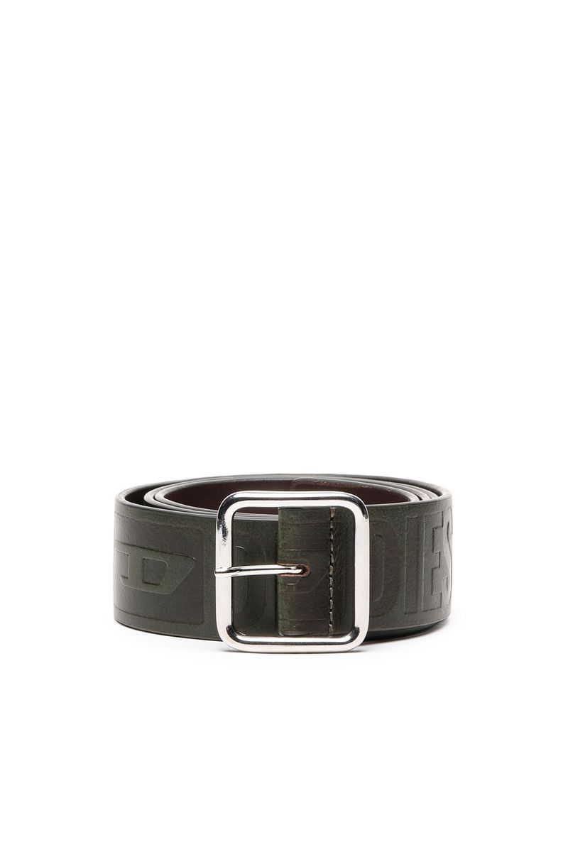 Cinto masculino em couro com a marca "Diesel D" em relevo por toda a sua extensão. Possui ponteira quadrada e fivela prateada polida.