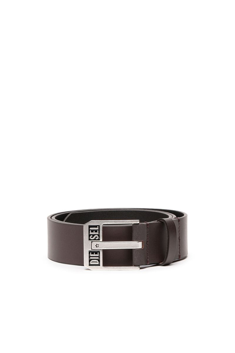 Este cinto masculino é feito de couro liso. Sua fivela de metal apresenta letras Diesel ao longo da borda, atualizadas com uma estrela gravada no pino.