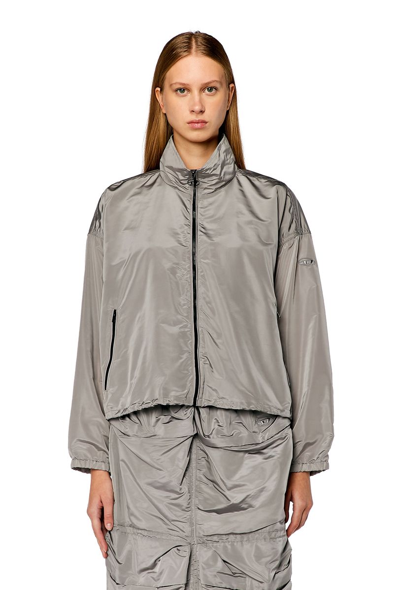Esta jaqueta feminina brilhante é cortada em Nylon ciré superfino que injeta movimento na silhueta. Sem forro para melhorar sua sensação fluida, tem formato de balão e cordas elásticas na bainha. Um Oval D bordado na manga.