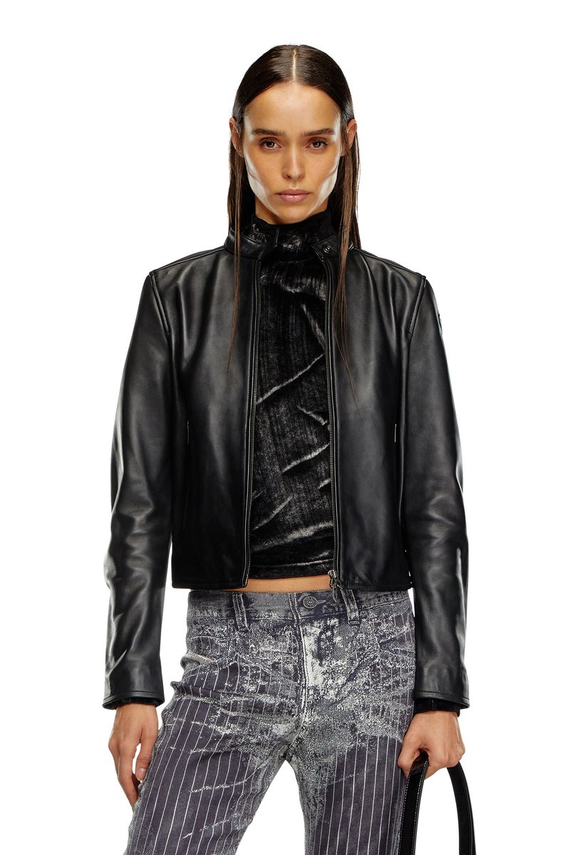 Jaqueta biker feminina confeccionada em couro preto macio. Projetada para um caimento regular, esta peça tem um corte limpo e estilo motociclista, com forro macio e detalhes do logotipo, como os puxadores de zíper em formato de D e a marca Oval D em relevo na manga.