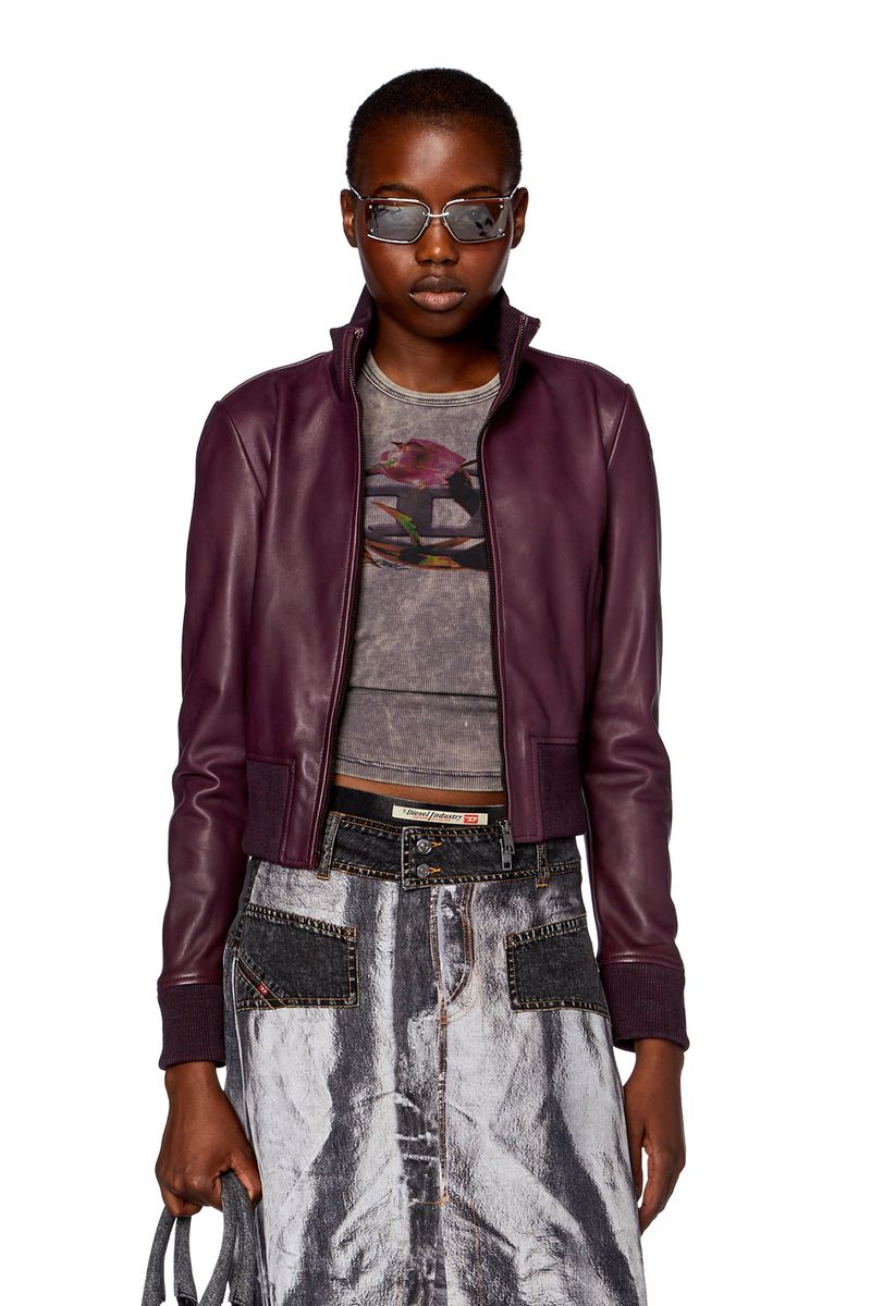 Jaqueta de couro feminina com silhueta bomber. Projetada para um ajuste regular, esta peça é confeccionada em couro encerado flexível com acabamentos canelados flexíveis e forro liso. Um logotipo D em relevo decora a manga esquerda.