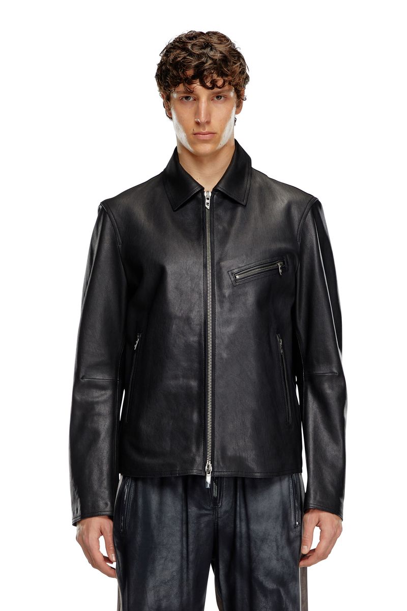 Jaqueta masculina feita de couro preto flexível, com gola elegante e ferragens de zíper. Esta peça não tem forro para uma alça mais leve e acabamento com a marca Oval D em relevo nas mangas.