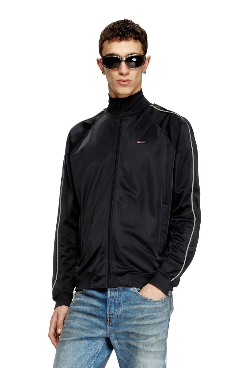 Jaqueta esportiva masculina em tecido tecnológico brilhante. Inspirada no estilo esportivo retrô, esta peça apresenta faixas laterais com acabamento em viés e um micro-logo bordado no peito. A modelagem é regular, com mangas raglan confortáveis ??e acabamento canelado elástico.