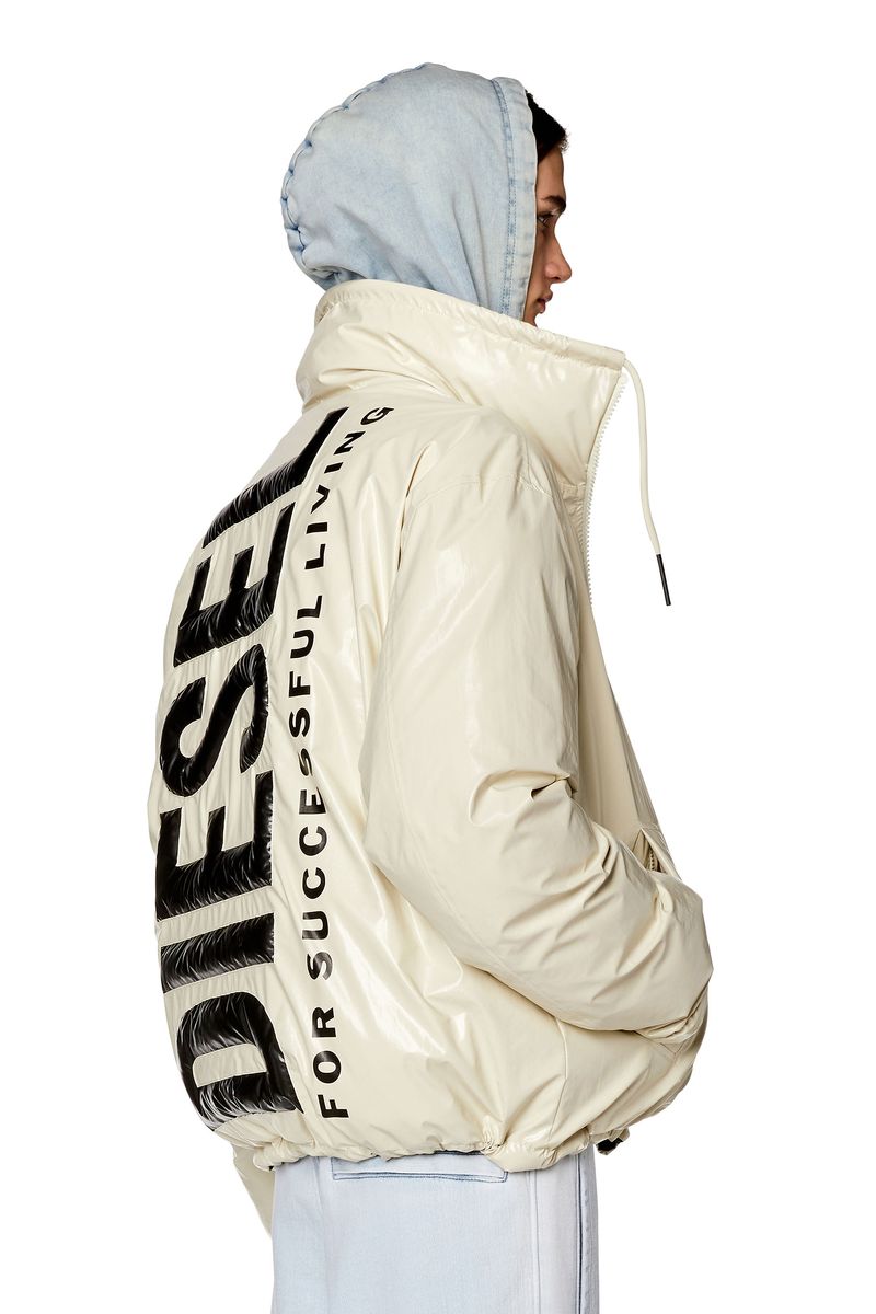 Esta jaqueta de inverno masculina é feita de nylon laminado brilhante e isolada com acolchoamento que imita plumas. Cortada em um formato solto, ela tem uma gola protetora ajustável com cordão e um logotipo superdimensionado estampado nas costas.