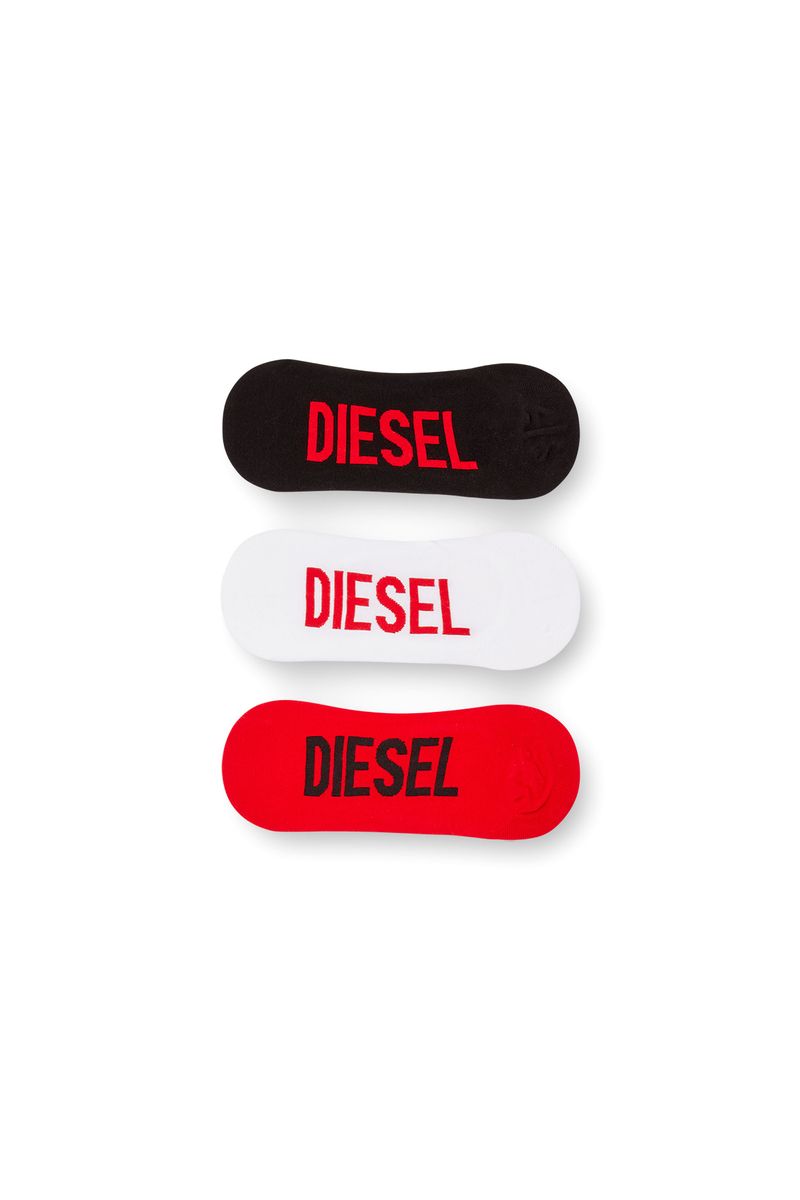 Pacote com três pares de meias invisíveis confeccionadas em uma mistura macia de algodão elástico. A inscrição "Diesel" em letras vibrantes percorre a sola.