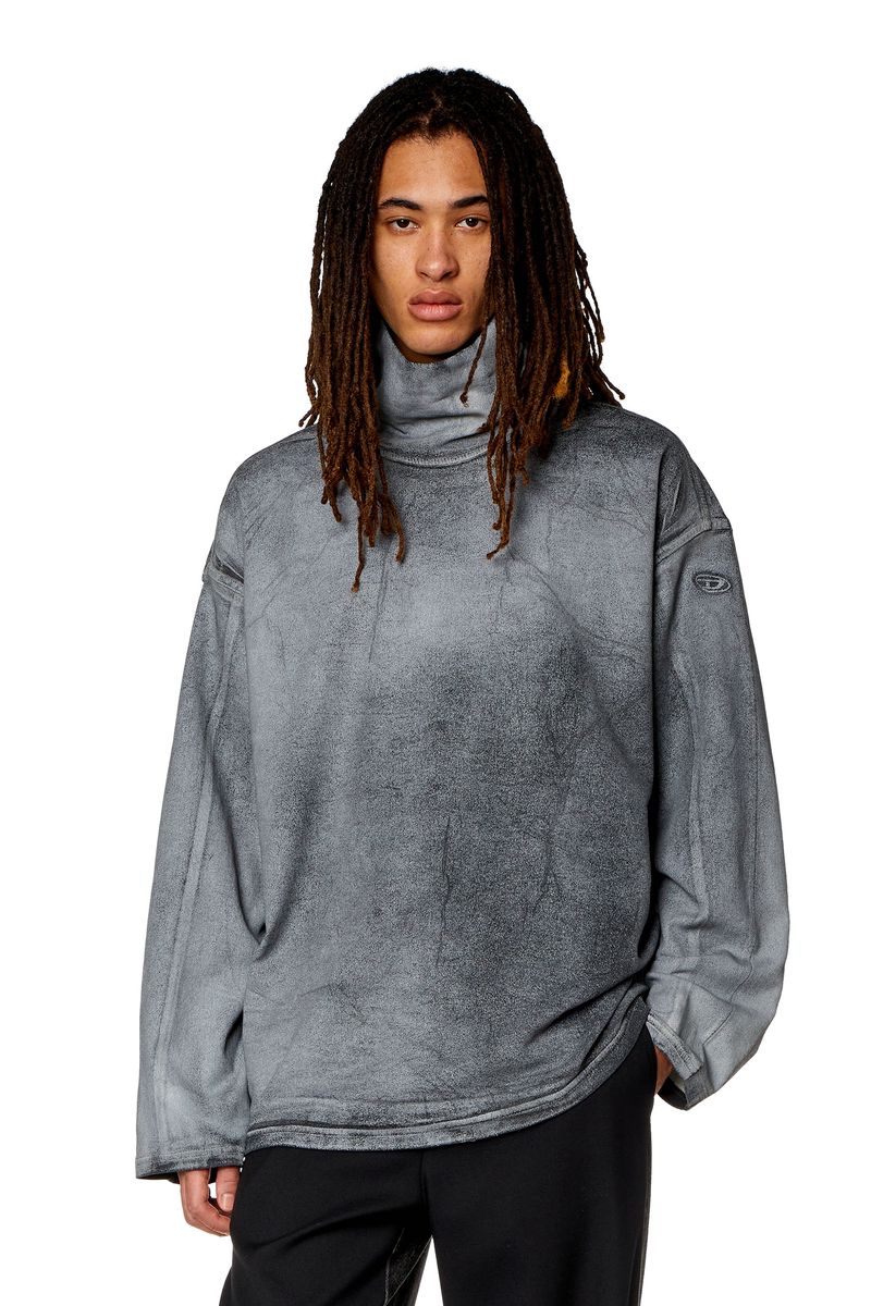 Este suéter masculino é feito de Track Denim para uma atitude descolada e ultraconfortável e um look jeans autêntico. A silhueta relaxada apresenta gola alta e mangas caídas.
