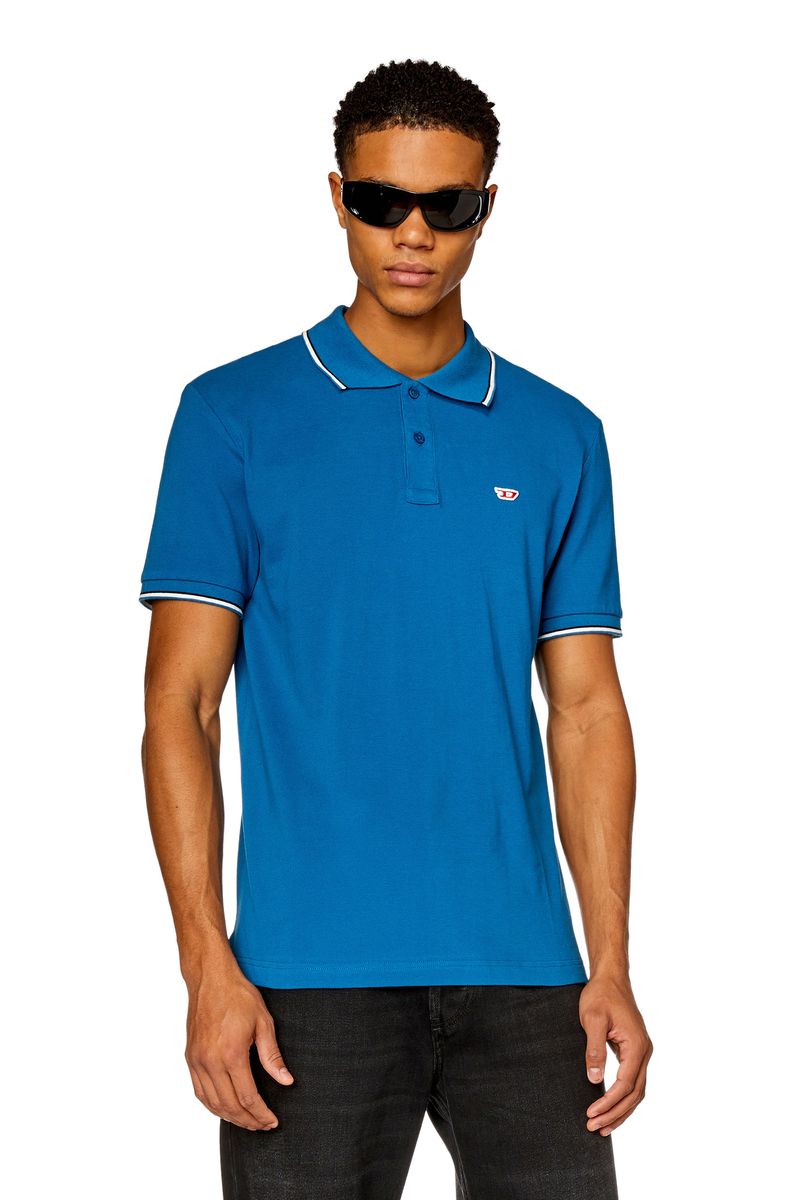 Camisa polo masculina confeccionada em piqué de algodão orgânico. Este estilo justo é detalhado com pontas listradas e um sutil remendo 'D' vermelho no peito.