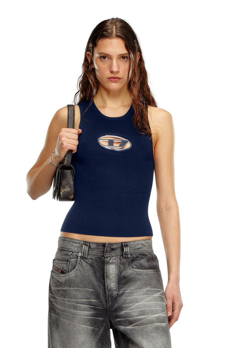 Esta regata feminina tem um recorte com placa de logotipo que deixa um pouco do colo à mostra. É feita de malha canelada bicolor macia e flexível, com um caimento justo ao corpo.