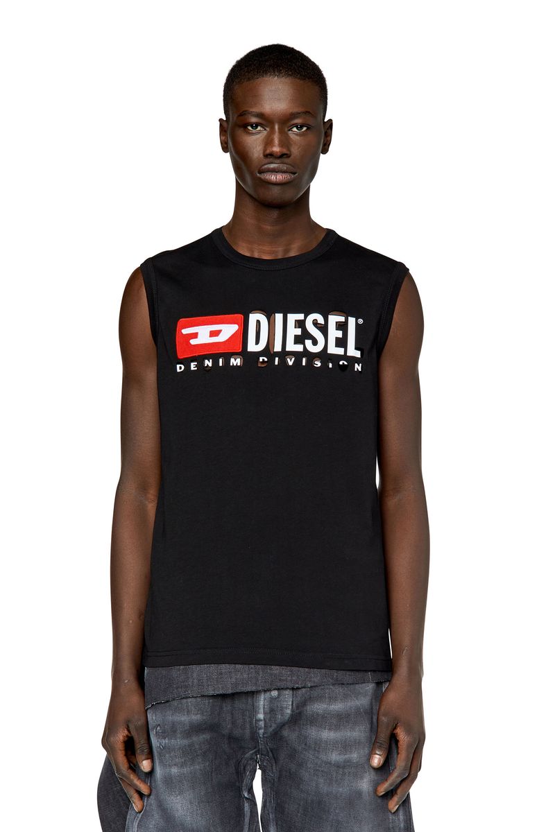 Este top masculino de jersey de algodão faz parte da edição Spring Summer 2023 Runway Show. Atualizando seu design clássico está a inscrição do logotipo da Diesel Denim Division no peito, deixada sem costura ao longo de algumas bordas para um efeito peel-off.