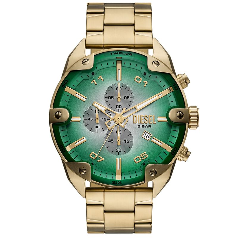 O Relógio Diesel DZ4685 faz parte da coleção Spiked, conhecida por seu design robusto e moderno. Fabricado com materiais de alta qualidade, possui caixa de aço inoxidável dourada e pulseira de aço dourada, garantindo durabilidade e estilo. Este modelo se destaca por suas funcionalidades: cronógrafo, calendário, e resistência à água de 5ATM (50 metros). Com uma caixa de 49mm, é um acessório imponente adequado para homens de estilo. 2 anos de garantia internacional