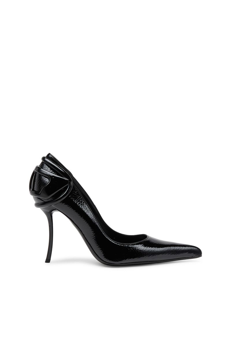 Este salto agulha feminino de 10,5 mm acrescenta um toque de elegância – o salto elegantemente curvado ancora o elegante detalhe oval em D que envolve a parte de trás do calçado, dando um toque exclusivo ao logotipo. Apresenta textura brilhante e enrugada, além de bicos bem pontudos.