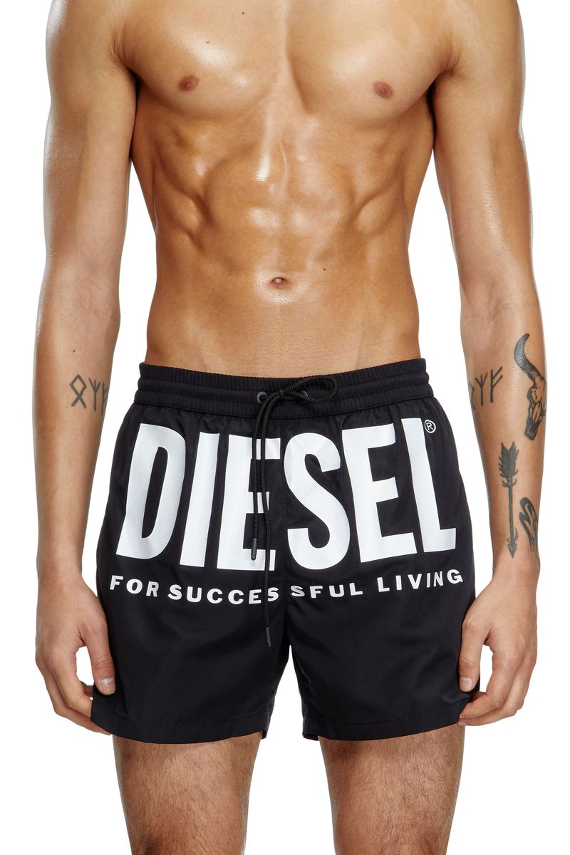 Calção de banho masculino em tecido reciclado de secagem rápida, com a estampa ousada do logo Diesel For Successful Living na parte frontal. Este modelo de comprimento médio possui três bolsos e um cós confortável ajustável com cordão.