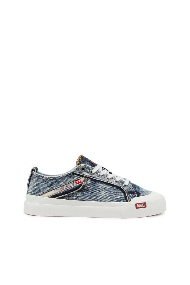 Estes tênis de cano baixo masculinos homenageiam a herança da Diesel através de sua construção em denim premium e características clássicas do jeans – observe o detalhe do bolso com rebites e a icônica etiqueta com o logo nas laterais. Com tratamento para um efeito desbotado, os tênis possuem reforço de borracha mais alto, biqueira mais fina com proteção de borracha grossa e solado vulcanizado durável com vibrantes detalhes em vermelho.