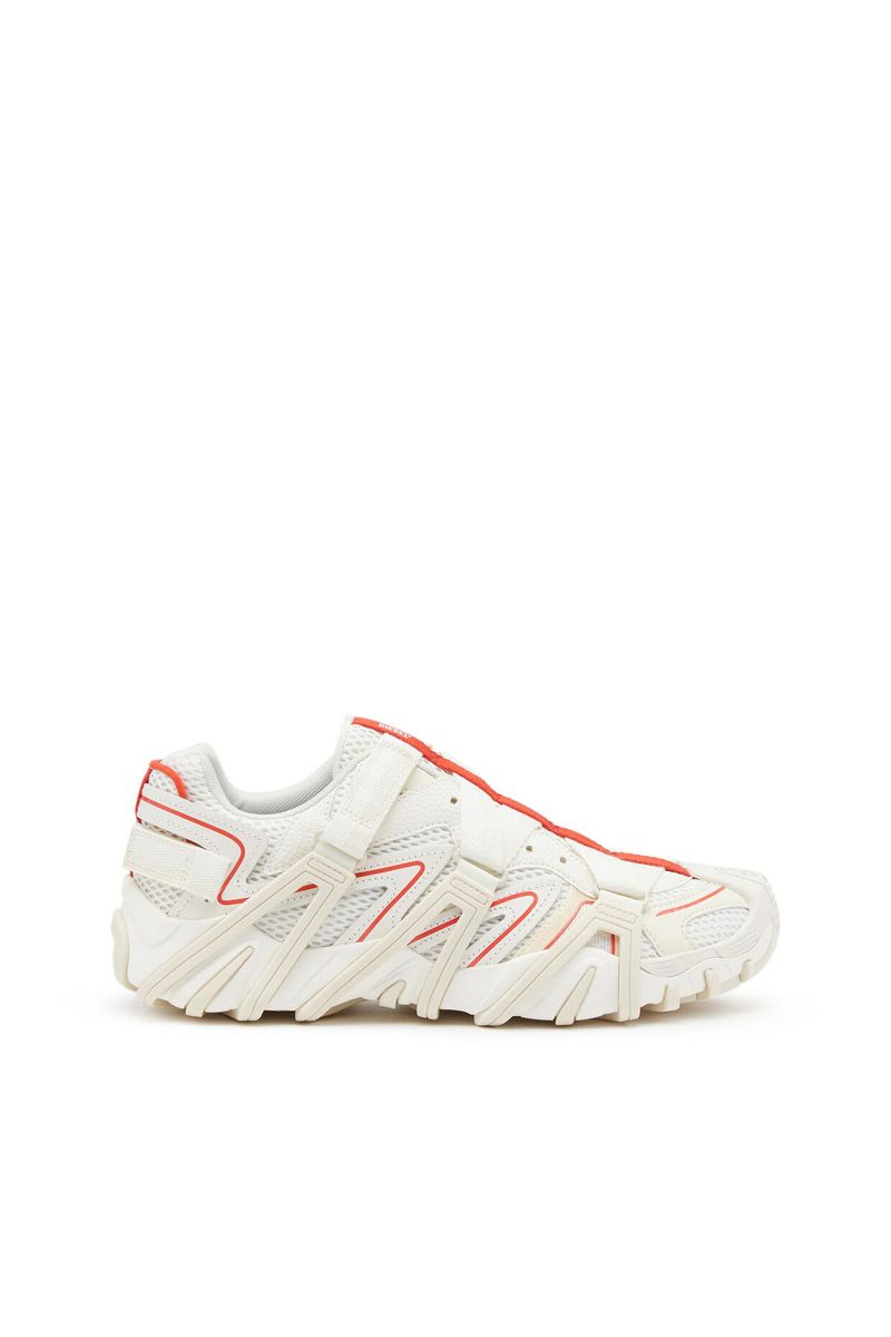 Tênis Diesel Prototype em mesh respirável e couro. O sapato é enjaulado em uma série de cruzamentos de fitas ancoradas à sola industrial por tirantes de borracha. A sola volta a envolver a biqueira e termina com um original 'dente' de borracha.