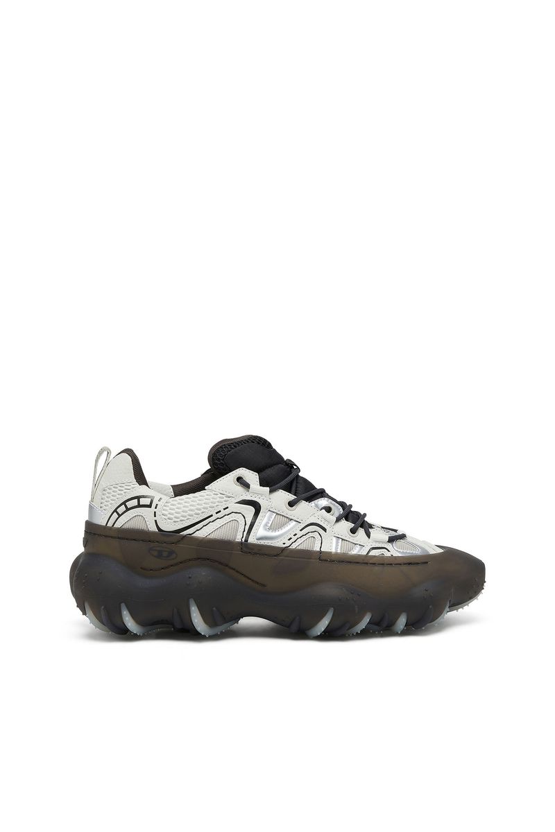 Feitos de PU flexível, malha e ripstop, esses tênis masculinos inovadores são detalhados com costuras, detalhes metálicos e linhas estampadas em relevo. Borracha translúcida sobe pela parte superior que é equipada com cadarços utilitários e colocada em uma sola ondulada de inspiração industrial com cápsulas de borracha estendidas para maior tração e aderência.