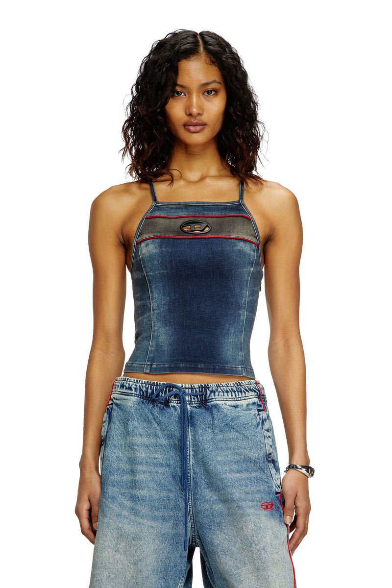 Este top cropped apresenta alças finas cruzadas e caimento justo. É confeccionado em jeans stretch azul-escuro, com detalhes de bigodes aparentes, incrustações contrastantes e detalhes em vermelho. A placa oval D em metal preto é detalhada com recortes que deixam a pele à mostra.